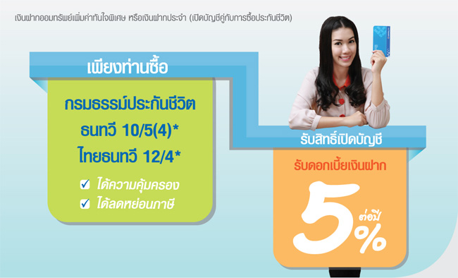 โปรโมชั่น บัญชีเงินฝากออมทรัพย์เพิ่มค่าทันใจพิเศษ อัตราดอกเบี้ยร้อยละ 5 ต่อปี สำหรับลูกค้าที่ซื้อกรมธรรม์ประกันชีวิต ธนทวี1 10/3, ธนทวี 12/4 และธนทวี 10/5(4) ของบริษัท ไทยประกันชีวิต จำกัด ผ่านสาขาธนาคาร ตั้งแต่วันที่ 2 มกราคม 2556 เป็นต้นไป