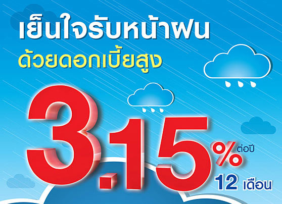 เปิดบัญชีเงินฝากประจำ 12 เดือน รับดอกเบี้ยหน้าฝน 3.15% ต่อปี และเมื่อเปิดบัญชี 6 เดือน รับดอกเบี้ยหน้าฝน 3.00% ต่อปี รับดอกเบี้ยทุกเดือน เริ่ม 1 กรกฎาคม 2556