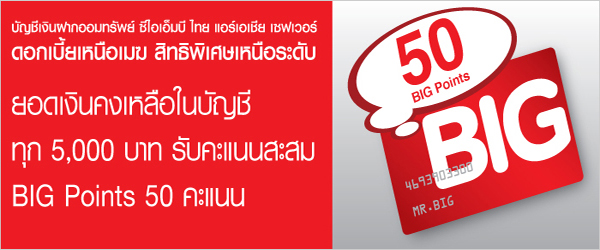 | รับฟรี ! 50 BIG Points ฝากมาก...รับ Point มาก - ยอดเงินคงเหลือเฉลี่ยแต่ละไตรมาส ทุก 5,000 บาท ได้รับ 50 BIG Point