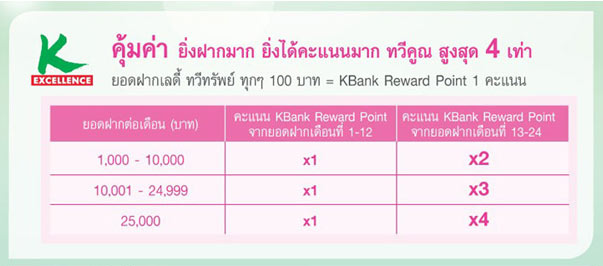 - ธนาคารจะมอบ KBank Reward Point 1 คะแนนต่อยอดเงินฝากเข้าบัญชีเลดี้ฯทุกๆ 100 บาท ตลอดระยะเวลา 24 เดือน