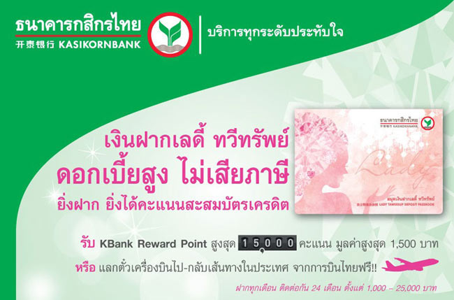 บัญชีเงินฝากเลดี้ ทวีทรัพย์ ให้ดอกเบี้ยสูง ไม่เสียภาษี ยิ่งฝากมาก ยิ่งได้คะแนนสะสมบัตรเครดิตเพิ่ม รับ KBank Reward Point สูงสุด 15,000 คะแนน มูลค่าสูงสุด 1,500 บาท หรือแลกตั๋วเครื่องบินไป-กลับ เส้นทางในประเทศ จากการบินไทยฟรี !!