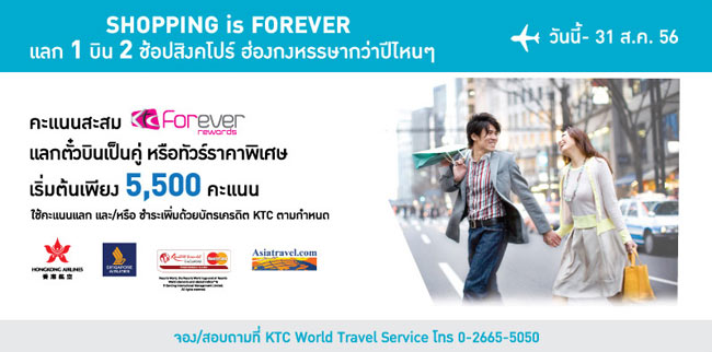 สมาชิกบัตรเครดิต KTC สุดคุ้มสุดหรรษา บิน ช้อป เที่ยว ที่สิงคโปร์ และฮ่องกง ด้วยคะแนนสะสม KTC Forever Rewards เลือกแลกตั๋วเครื่องบินไปกลับ หรือ แพ็คเกจ Free and Easy ดังนี้