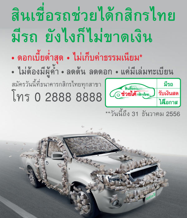 นายปกรณ์ พรรธนะแพทย์ รองกรรมการผู้จัดการ ธนาคารกสิกรไทย และนายอิสระ วงศ์รุ่ง ประธานกรรมการบริหาร บริษัท ลีสซิ่งกสิกรไทย จำกัด เปิดแคมเปญ "สินเชื่อรถช่วยได้ มีรถยังไงก็ไม่ขาดเงิน" สินเชื่อรถแลกเงินสำหรับรถยนต์อายุ 1 - 17 ปีทุกยี่ห้อตามเงื่อนไขที่กำหนด ด้วยดอกเบี้ยแบบลดต้นลดดอก ต่ำสุดเพียง 7.48% ผ่อนได้นานสูงสุด 72 เดือน ไม่เก็บค่าธรรมเนียม ทั้งยังโปะได้ โดยไม่ต้องมีผู้ค้ำประกัน ตั้งแต่วันนี้ - 31 ธ.ค.56 ณ ธนาคารกสิกรไทยทุกสาขา