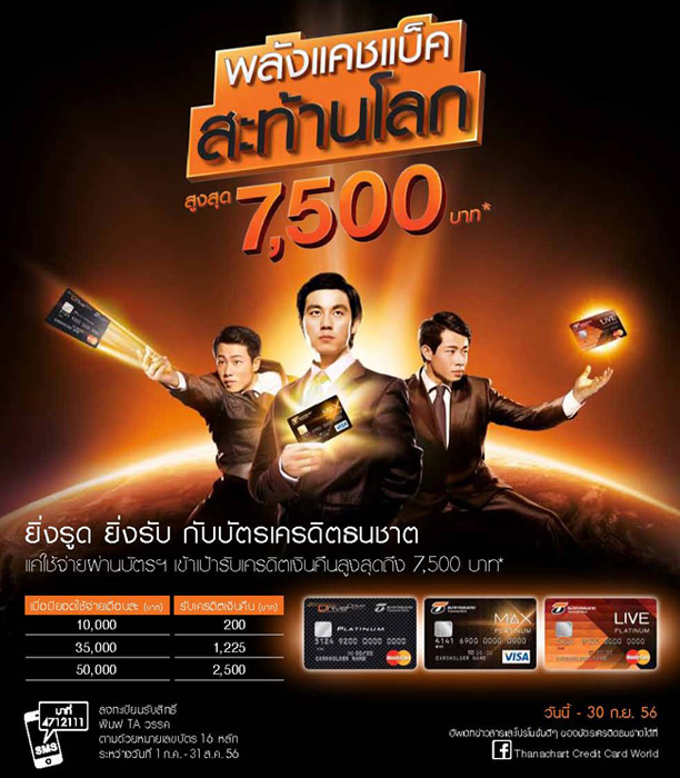 "พลังแคชแบ็คสะท้านโลก" กับบัตรเครดิตธนชาต รับเงินคืนสูงสุด 7,500 บาท วันนี้ - 30 ก.ย.56 นี้ เท่านั้น