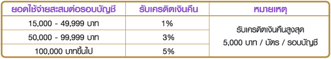 เงื่อนไข - สงวนสิทธิ์ในการให้เครดิตเงินคืน เฉพาะสมาชิกบัตรที่มียอดใช้จ่ายจากบัตรหลัก และบัตรเสริมสะสมรวมกันตามที่กำหนด และจะต้องเป็นยอดใช้จ่ายที่มีมูลค่า 1,500 บาทขึ้นไปต่อเซลล์สลิป