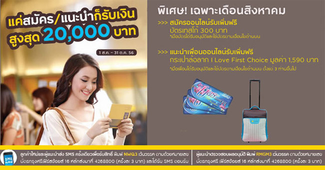 โปรโมชั่นจากบัตรกรุงศรีเฟิร์สช้อยส์ แค่สมัคร หรือแนะนำเพื่อน ก็รับเงินสูงสุด 20,000 บาท (1 ส.ค.- 31 ต.ค.56) และ พิเศษ! เฉพาะเดือนสิงหาคม สมัครออนไลน์รับเพิ่มฟรี บัตรเทสโก้ โลตัส 300 บาท หรือแนะนำเพื่อนสมัครออนไลน์รับเพิ่มฟรี กระเป๋าล้อลาก I Love First Choice มูลค่า 1,590 บาท
