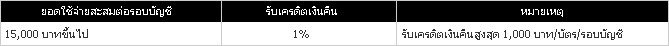 - สงวนสิทธิในการให้เครดิตเงินคืน เฉพาะสมาชิกบัตรที่มียอดใช้จ่ายจากบัตรหลักและบัตรเสริมสะสมรวมกันตามที่กำหนด และจะต้องเป็นยอดใช้จ่ายที่มีมูลค่า 1,500 บาทขึ้นไปต่อเซลล์สลิป
