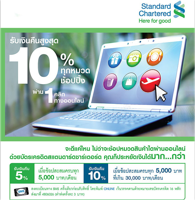 สแตนดาร์ดชาร์เตอร์ด (SCBT) ให้ลูกค้าบัตรเครดิตของทางธนาคารรับเงินคืนสูงสุดถึง 10% เมื่อช้อปปิ้งสินค้าหรือบริการทุกหมวด ด้วยบัตรเครดิตสแตนดาร์ดชาร์เตอร์ดผ่านช่องทางออนไลน์ ให้คุณคุ้มและประหยัดเงินได้มาก...กว่า โดย