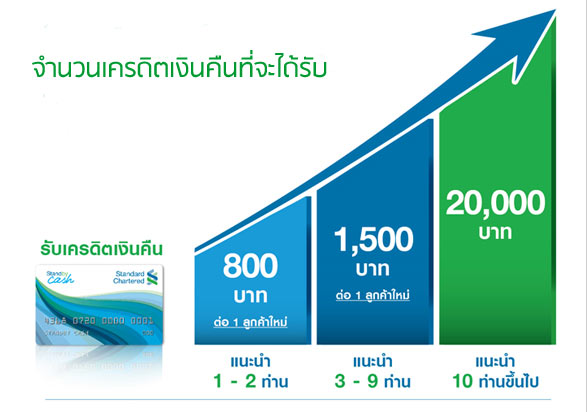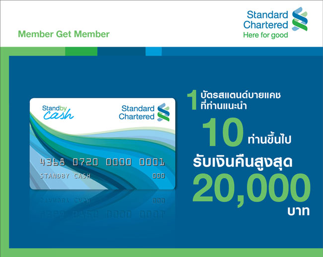 - ธนาคารฯ จะทำการรวบรวมจำนวนลูกค้าใหม่ที่ได้รับอนุมัติวงเงินสแตนด์บายแคชหลังสิ้นสุดรายการส่งเสริมการขาย โดยสามารถตรวจสอบผลอนุมัติได้ที่ www.standardchartered.co.th ภายใน 30 วันหลังจากที่สิ้นสุดรายการส่งเสริมการขาย และขอสงวนสิทธิ์ในการมอบเงินคืนแก่ผู้แนะนำ เฉพาะกรณีที่ลูกค้าใหม่ยังคงมีวงเงินสแตนด์บายแคชอยู่ และมีประวัติการชำระที่ดีจนถึงวันที่เครดิตเงินคืน ทั้งนี้ จำนวนเงินคืนขึ้นอยู่กับจำนวนลูกค้าใหม่ซึ่งปฏิบัติตามเงื่อนไขของรายการนี้