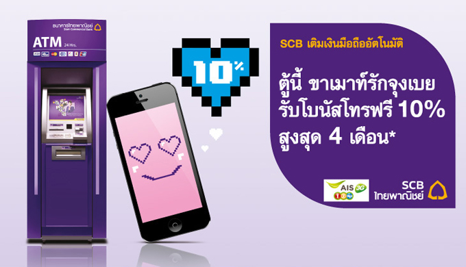 เงื่อนไขการให้บริการ - บริการ SCB เติมเงินมือถืออัตโนมัติ เป็นการให้บริการเฉพาะลูกค้า One-2-Call โดยการหักผ่านบัญชีธนาคารไทยพาณิชย์อัตโนมัติ สามารถสมัครได้ที่ตู้ ATM ไทยพาณิชย์ หรือ AIS Shop ทั่วประเทศ