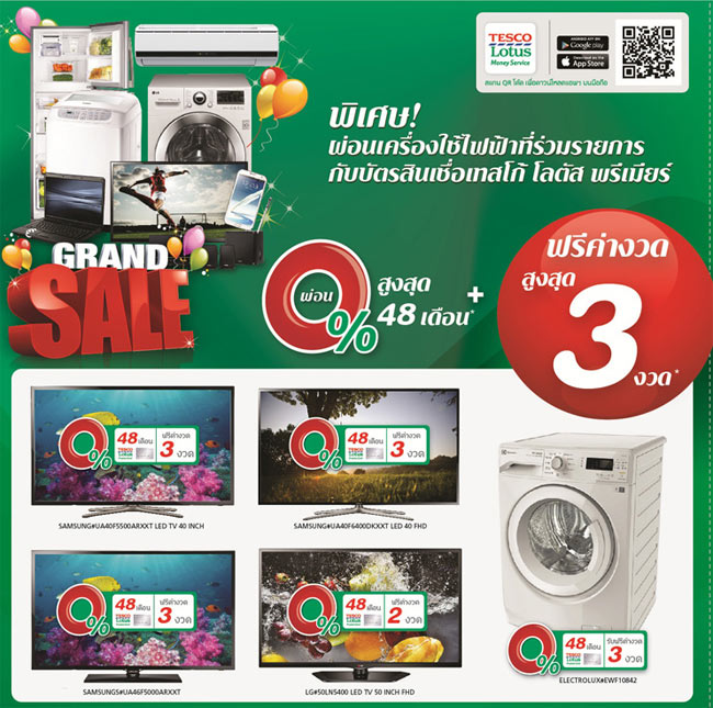 Grand Sale พิเศษ! ผ่อนเครื่องใช้ไฟฟ้าที่ร่วมรายการกับบัตรสินเชื่อเทสโก้ โลตัส พรีเมียร์ ให้คุณผ่อน 0% 48 เดืิอน + ฟรีค่างวดสูงสุด 3 งวด