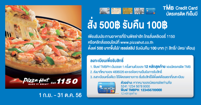 - เพียงชำระค่าอาหารด้วยบัตรเครดิต TMB ที่ ร้านพิซซ่าฮัททุกสาขา สั่งเดลิเวอรี่ หรือสั่งออนไลน์ www.pizzahut.co.th ตั้งแต่ 500 บาทขึ้นไป/เซลล์สลิป รับเงินคืน 100 บาท จำกัดเงินคืนสูงสุด 100 บาท/บัตร/เดือน