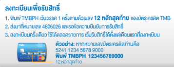 พิมพ์ TMBPH เว้นวรรค 1 ครั้งแล้วตามด้วย 12 หลักท้ายของหมายเลขบัตรเครดิต TMB ของท่านแล้วส่งมาที่ 4806026