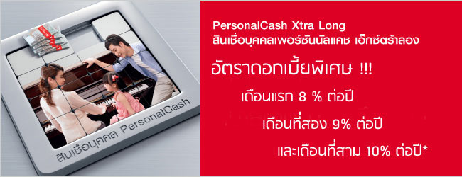 - สิทธิพิเศษสำหรับผู้สมัครสินเชื่อ เพอร์ซันนัลแคช เอ็กซ์ตร้าลอง ตั้งแต่วันที่ 1 กันยายน 2556 - 31 ธันวาคม 2556 เท่านั้น และวงเงินอนุมัติตั้งแต่ 50,000 บาทขึ้นไป