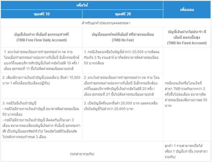 - อัตราดอกเบี้ย 0% (สำหรับบัญชีเงินฝาก ทีเอ็มบี ธุรกรรมทำฟรี)