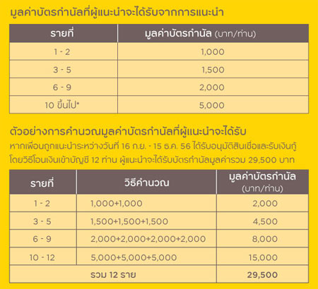 - ขอสงวนสิทธิ์ไม่เปิดเผยข้อมูลการอนุมัติสินเชื่อ โดยจะแจ้งให้ผู้แนะนำทราบเฉพาะจำนวนของลูกค้าใหม่ และมูลค่าบัตรกำนัลที่มีสิทธิจะได้รับเท่านั้น โดยสามารถสอบถามได้ที่ โทร. 1572