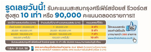รูดเลยวันนี้! บัตรเครดิตกรุงศรีเฟิร์สช้อยส์ ให้คะแนนสะสมกรุงศรีเฟิร์สช้อยส์ รีวอร์ดส สูงสุด 10 เท่า หรือ 90,000 คะแนนตลอดรายการ เพียงมียอดใช้จ่ายสะสมต่อเดือนตามเงื่อนไขที่กำหนด และสามารถใช้คะแนนแลกรับของกำนัลโดนใจมากมายกว่า 250 รายการ ที่ www.firstchoice.co.thรับคะแนนสะสมเมื่อมียอดใช้จ่ายตามเงื่อนไข ดังนี้