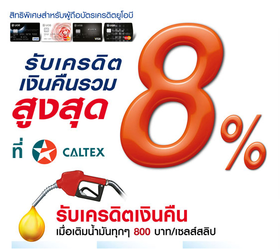 รับเครดิตเงินคืนสูงสุด 8% ที่ CALTEX เมื่อใช้ผ่านบัตรเครดิตยูโอบี