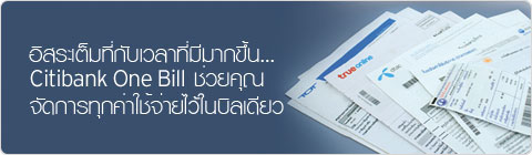 อิสระเต็มที่กับเวลาที่มีมากขึ้น Citibank One Bill ช่วยคุณจัดการทุกค่าใช้จ่ายไว้ในบิลเดียว คุณจึงมีอิสระที่จะสนุกกับชีวิตได้อย่างที่ต้องการ