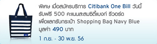 - ธนาคารฯ จะโอนคะแนนสะสมซิตี้แบงก์ รีวอร์ด สำหรับลูกค้าที่สมัครตั้งแต่วันที่ 1 ก.ย. - 30 พ.ย. 56 ภายใน 31 ม.ค. 57 (การแลกกระเป๋าด้วยคะแนนสะสมซิตี้แบงก์รีวอร์ด มีกำหนดระยะเวลาแลกรับจนถึง 31 ธ.ค. 56)
