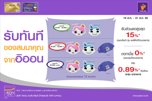- ผ่อนสินค้ายอดสินเชื่อตั้งแต่ 30,000 บาทขึ้นไป รับ AE Chan หรือ ON Kun 1 ใบ และ ร่ม Arigato 1 อัน