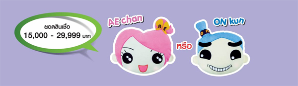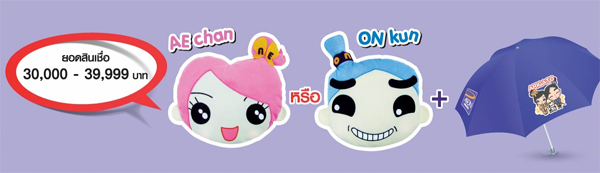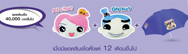 - ผ่อนสินค้ายอดสินเชื่อตั้งแต่ 40,000 บาทขึ้นไป รับ AE Chan และ ON Kun 1 ใบ และ ร่ม Arigato 1 อัน