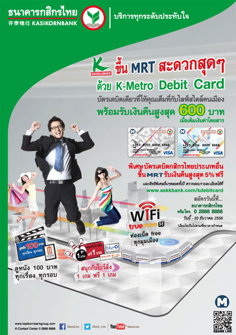 - Cash Back 10% สำหรับผู้ที่รูดเติมเงินผ่านบัตร K-Metro Debit Card เท่านั้น ระหว่างวันที่ 1 ต.ค.56 - 30 ธ.ค.56
