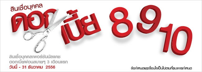 | วงเงิน (บาท) | ดอกเบี้ย/ ปี (เดือนที่ 1) | ดอกเบี้ย/ ปี (เดือนที่ 2) | ดอกเบี้ย/ ปี (เดือนที่ 3) | ดอกเบี้ย/ ปี (เดือนที่ 4 เป็นต้นไป) |