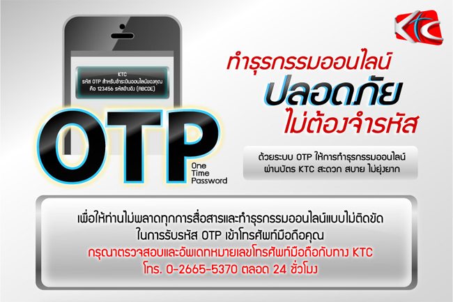 OTP เป็นระบบที่พัฒนาขึ้นเพื่อเพิ่มความปลอดภัยในการทำธุรกรรมออนไลน์ โดย OTP คือ รหัสครั้งเดียว [One Time Password] ที่ใช้ยืนยันการทำธุรกรรมออนไลน์ต่างๆ ของ KTC ซึ่งรหัส OTP จะใช้ได้เพียงครั้งเดียวต่อหนึ่งธุรกรรม และไม่สามารถนำกลับมาใช้งานซ้ำได้ รหัส OTP มีอายุการใช้งาน 3 นาทีต่อ 1 รหัส OTP เท่านั้น และหากทำการขอรหัส OTP อีกครั้ง รหัส OTP เดิมจะหมดอายุลง โดย KTC จะทำการส่ง SMS ผ่านหมายเลขโทรศัพท์มือถือที่ท่านได้ให้ไว้กับ KTC เท่านั้น