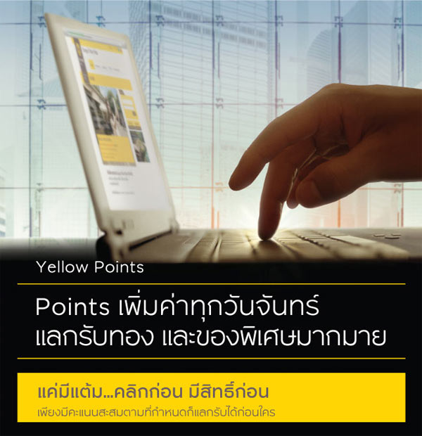 Yellow Point... Point เพิ่มค่าทุกวันจันทร์ แลกรับทอง และของพิเศษมากมาย แค่มีแต้ม...คลิกก่อน มีสิทธิ์ก่อน เพียงมีคะแนนสะสมตามที่กำหนดก็แลกรับได้ก่อนใคร รีบสะสมแต้มได้แล้ววันนี้ แลกของกำนัลได้ทุกวันจันทร์ต้นเดือน และทุกวันจันทร์ของเดือน ต.ค. - ธ.ค.56