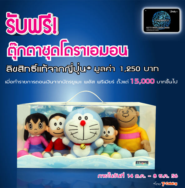 พิเศษ!! สำหรับลูกค้าที่ได้รับอัตราดอกเบี้ยพิเศษ 19.8% รับฟรีตุ๊กตาชุดโดราเอมอน ลิขสิทธิ์แท้จากญี่ปุ่น โดย 7-Catalog มูลค่า 1,250 บาท* (ขอสงวนสิทธิ์ลูกค้า 1 ท่าน รับได้สูงสุด 1 ชิ้น) เมื่อทำรายการถอนเงินจากบัตรยูเมะพลัส พรีเมียร์ ตั้งแต่ 15,000 บาทขึ้นไป