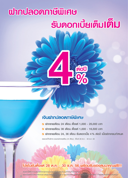 - อัตราดอกเบี้ยคงที่ตลอดระยะเวลาฝากและธนาคารจ่ายดอกเบี้ยเมื่อครบกำหนด