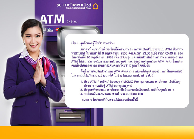 ธนาคารไทยพาณิชย์ ขอเรียนให้ทราบว่า ธนาคารจะปิดปรับปรุงระบบ ATM ชั่วคราวทั่วประเทศ ในวันเสาร์ที่ 9 พฤศจิกายน 2556 ตั้งแต่เวลา 23.00 น.ถึงเวลา 05.00 น. ของวันอาทิตย์ที่ 10 พฤศจิกายน 2556 เพื่อปรับปรุง และเพิ่มประสิทธิภาพการทำงานของระบบ ATM ให้สามารถรองรับการขยายตัวของลูกค้า และธุรกรรมผ่านเครื่อง ATM ที่เพิ่มขึ้นอย่างต่อเนื่องได้ตลอดเวลา เพื่อยกระดับคุณภาพบริการลูกค้าให้ดียิ่งขึ้น