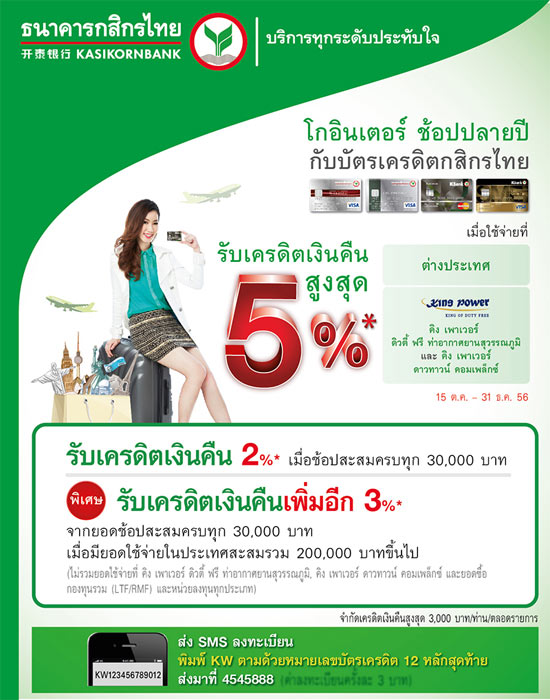 โกอินเตอร์ ช้อปปลายปีกับบัตรเครดิตกสิกรไทย รับเครดิตเงินคืนสูงสุด 5%* เมื่อใช้จ่ายที่ต่างประเทศ คิง พาวเวอร์ ดิวตี้ ฟรี ท่าอากาศยานสุวรรณภูมิ และคิง เพาเวอร์ ดาวทาวน์ คอมเพล็กซ์ (ตามเงื่อนไขที่ธนาคารกำหนด)