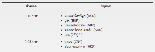 **ส่วนลด 0.10 บาทและ 0.05 บาทต่อ 1 หน่วยเงินตราต่างประเทศ ยกเว้นสกุลเยน ได้รับส่วนลด 0.10 บาทต่อ 100 เยน