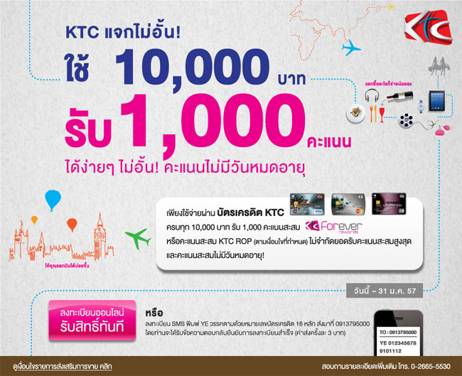 เงื่อนไขรายการส่งเสริมการขาย - รายการส่งเสริมการขายนี้ บริษัท บัตรกรุงไทย จำกัด (มหาชน) หรือเคทีซี จัดทำขึ้นเพื่อมอบสิทธิประโยชน์ให้แก่สมาชิกบัตรเครดิต KTC ทุกประเภทที่มีคะแนนสะสม Forever Rewards และ/หรือ คะแนนสะสม KTC ROP ทั้งบัตรหลัก และบัตรเสริม ที่ลงทะเบียนเข้าร่วมรายการ และมียอดการใช้จ่ายผ่านบัตรเครดิตตามเงื่อนไขที่กำหนด ตั้งแต่วันที่ 1 พ.ย.56 - 31 ม.ค.57 ยกเว้น สมาชิกบัตรเครดิต KTC Cash Back, KTC ศูนย์บริการโลหิตแห่งชาติสภากาชาดไทย, KTC Visa Corporate Gold และ KTC เพื่อหน่วยงานรัฐ ไม่สามารถเข้าร่วมรายการนี้ได้