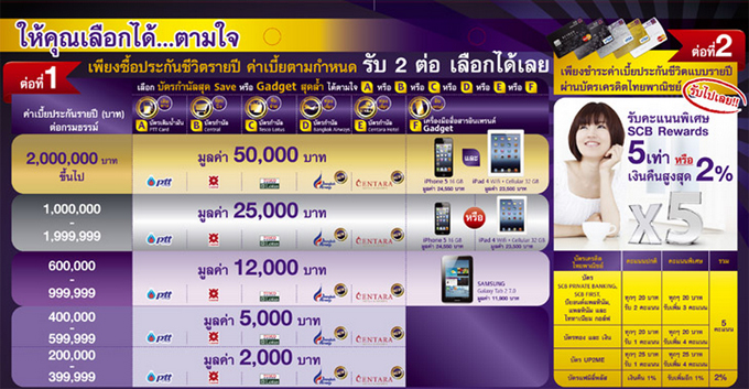 - ทุกยอดชำระค่าเบี้ยประกัน 20 บาท สำหรับบัตร SCB Private Banking, บัตร SCB First, บัตรเครดิตไทยพาณิชย์ บียอนด์ แพลทินัม, และไททาเนียมกอล์ฟ รับคะแนนสะสม SCB Rewards ปกติ 2 คะแนน และคะแนนสะสม SCB Rewards พิเศษเพิ่มอีก 3 คะแนน รวมเป็น 5 คะแนนสำหรับบัตรไทยพาณิชย์บัตรทอง และบัตรเงิน รับคะแนนสะสม SCB Rewards ปกติ 1 คะแนน และคะแนนสะสม SCB Rewards พิเศษเพิ่มอีก 4 คะแนน รวมเป็น 5 คะแนน สำหรับเป็นบัตรไทยพาณิชย์ UP2ME ทุก 25 บาท รับคะแนนสะสม SCB Rewards ปกติ 1 คะแนนและคะแนนสะสม SCB Rewards พิเศษเพิ่มอีก 4 คะแนน รวมเป็น 5 คะแนน บัตรเครดิตแฟมิลี่ พลัส รับเครดิตเงินคืนปกติ 1% และเครดิตเงินคืนเพิ่มอีก 1% ของยอดชำระค่าเบี้ยประกันรวมเป็น 2%