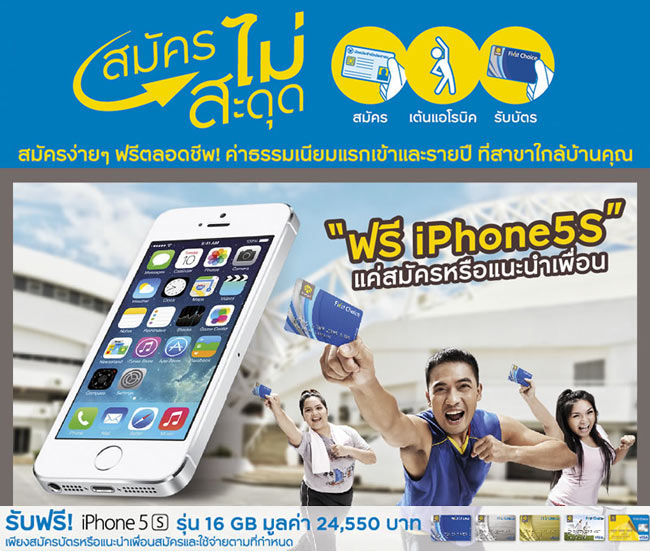 สมัครไม่สะดุด สมัครง่ายๆ ฟรี! ค่าธรรมเนียมแรกเข้า และรายปีตลอดชีพ พร้อมโปรโมชั่น "ฟรี iPhone 5s รุ่น 16GB มูลค่า 24,550 บาท" แค่สมัครหรือแนะนำเพื่อนสมัคร และใช้จ่ายตามที่กำหนด