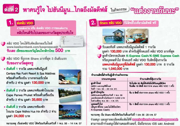 - รายการส่งเสริมการขายสำหรับลูกค้าที่สมัคร K-Express Cash พร้อมใช้บริการเงินสดโอนไว หรือลูกค้าที่สมัคร K-Express Cash และใช้บริการเงินสดทันใจโทรสั่งได้ในช่วงวันที่ 1 พ.ย.56 - 28 ก.พ.57 และได้รับการอนุมัติสินเชื่อภายในวันที่ 31 มี.ค.57 โดยธนาคารจะคิดจากยอดที่ใช้บริการสูงสุดเพียงยอดเดียว เพื่อร่วมรับรางวัลในต่อที่ 1