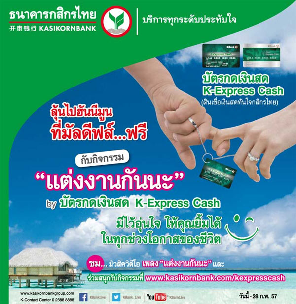 ชวนคนรู้ใจ ไปฮันนีมูนมัลดีฟส์ฟรี! กับแคมเปญแต่งงานกันนะ by บัตรกดเงินสด K-Express Cash สมัครบัตรวันนี้ รับข้อเสนอพิเศษ 2 ต่อ
