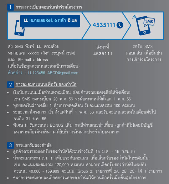 ระยะเวลาโปรโมชั่น : 1 พ.ค.56 - 31 ธ.ค.56 (แลกรับของกำนัลได้ระหว่างวันที่ 15 ม.ค.- 15 ก.พ.57)