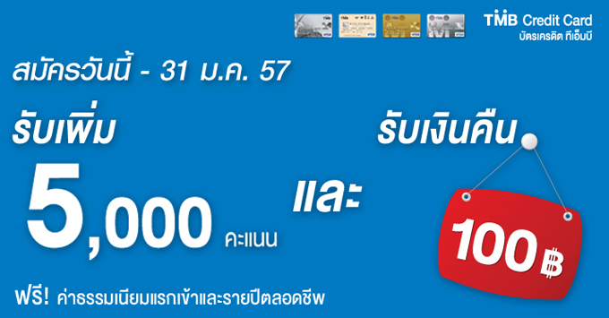 สมัครบัตรเครดิต TMB รับเพิ่ม 5,000 คะแนน รับเงินคืน 100 บาท