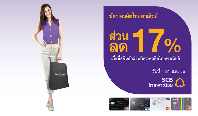 บัตรเครดิตไทยพาณิชย์ ส่วนลด 17% เมื่อซื้อสินค้าผ่านบัตรเครดิตไทยพาณิชย์ วันนี้ - 31 ธ.ค. 56 ที่ www.wearyouwant.com เท่านั้น ไม่มีขั้นต่ำ ไม่จำกัดจำนวนครั้ง