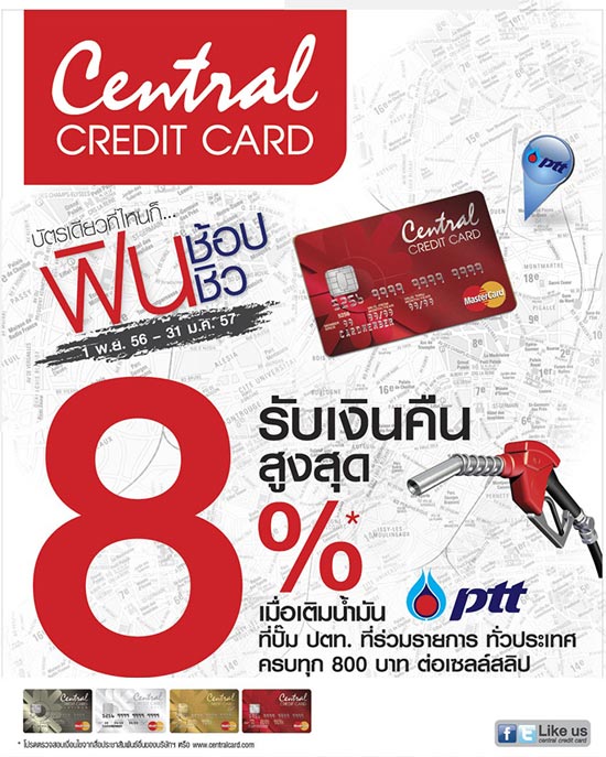บัตรเครดิตเซ็นทรัลให้คุณรับเงินคืนสูงสุด 8%* เมื่อเติมน้ำมันที่ปั๊ม ปตท.ที่ร่วมรายการทั่วประเทศ ครบทุก 800 บาท ต่อเซลล์สลิป หรือรับเครดิตเงินคืนตามเงื่อนไข ดังนี้
