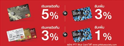 - สมาชิกบัตรที่เป็นสมาชิกพีทีทีบลูการ์ด (มีหมายเลขบัตรประชาชนถูกต้องตรงกัน) ยอดใช้จ่ายทุก 800 บาท ต่อเซลส์สลิป สำหรับบัตรแพลทินัม จะได้รับเครดิตเงินคืนเพิ่มอีก 3% จะได้รับเครดิตเงินคืนเพิ่มอีก 24 บาท และสูงสุดไม่เกิน 72 บาท ต่อบัญชีบัตรหลัก ต่อเดือน