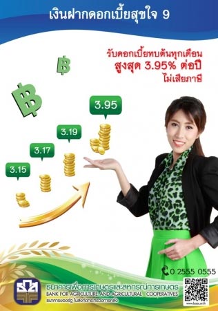 ธ.ก.ส. เปิดตัวบัญชีเงินฝากดอกเบี้ยสุขใจ 9 รับดอกเบี้ยทบต้นทุึกเดือน สูงสุด 3.95% ต่อปี