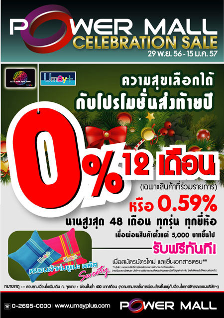 ฉลองเทศกาลแห่งความสุขส่งท้ายปี ที่เลือกได้ไปกับบัตรยูเมะพลัส ในงาน Power Mall Celebration Sale เลือกผ่อนสินค้า และเครื่องใช้ไฟฟ้าสุดสมาร์ท รับดอกเบี้ยพิเศษ 0% นาน 12 เดือน (เฉพาะสินค้าที่ร่วมรายการ) หรือเลือกผ่อนสบายๆ 0.59% นานสูงสุด 48 เดือน สำหรับสินค้่าทุกรุ่น ทุกยี่ห้อ ตั้งแต่ 5,000 บาทขึ้นไป