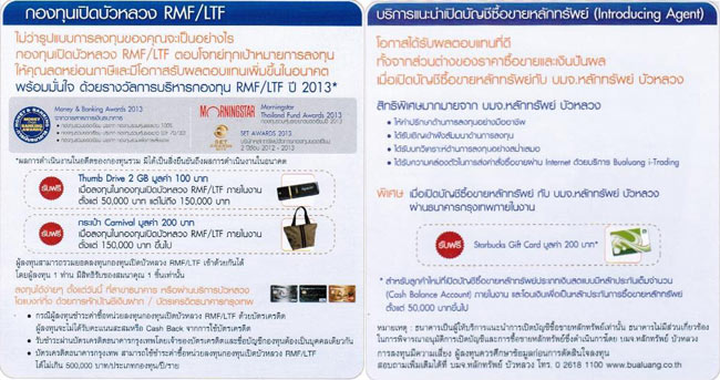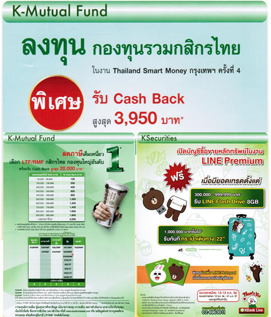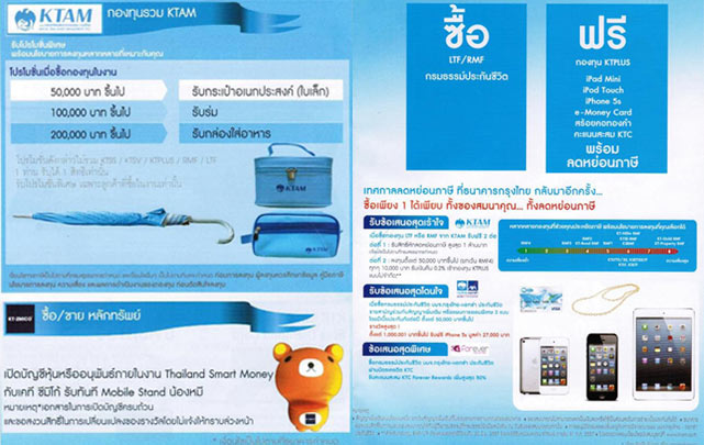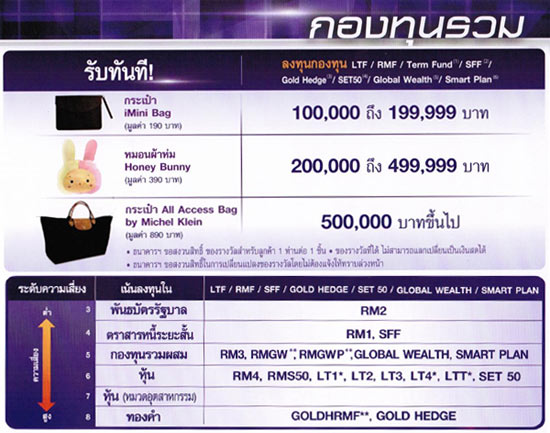 เนื่องจากตอนนี้ใกล้สิ้นปี หลายๆ คนอาจสนใจโปรโมชั่นเด่นๆ ของกองทุน LTF หรือ RMF เพื่อสิทธิพิเศษทางด้านภาษี เราจึงนำตัวอย่างโปรโมชั่นจากบริษัทจัดการกองทุนของกลุ่มธนาคารหลายๆ กลุ่มที่มาร่วมในงานนี้มาให้ดู ตัวอย่างเช่น