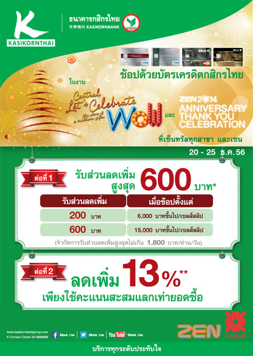 ช้อปด้วยบัตรเครดิตกสิกรไทยที่ ZEN และ Central World รับส่วนลด 2 ต่อ*