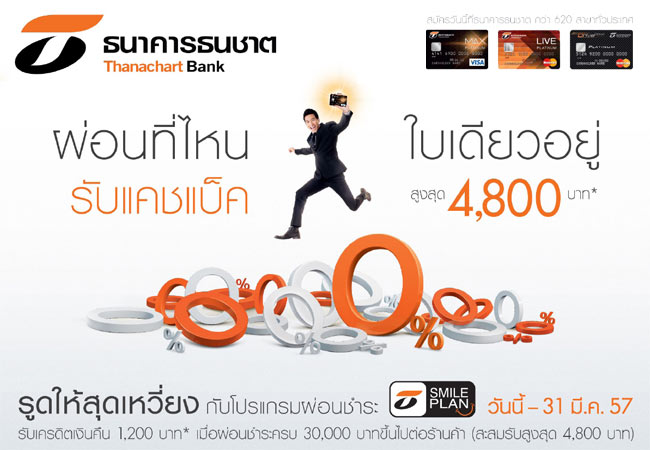 บัตรเครดิตธนาคารธนชาต ให้คุณรูดสุดเหวี่ยงกับโปรแกรมผ่อนชำระ ธนชาต Smile Plan และรับเครดิตเงินคืน 1,200 บาท* เมื่อผ่อนชำระครบ 30,000 บาทขึ้นไปต่อร้านค้า (สะสมรับสูงสุด 4,800 บาท)